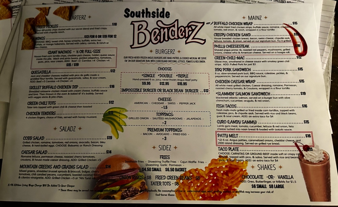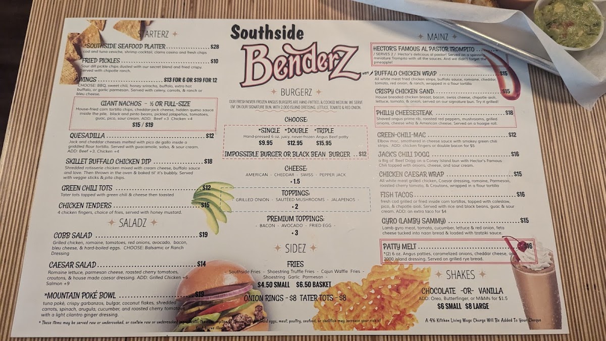 In conclusion, Southside Benderz embodies a refreshing take on American dining with a local twist. With a diverse menu, welcoming staff, and a delightful bar selection, it is a must-visit whether you’re a local or just passing through on your way to the breathtaking mountains. Come for the food, stay for the atmosphere — Southside Benderz promises an experience that lingers long after the last bite.